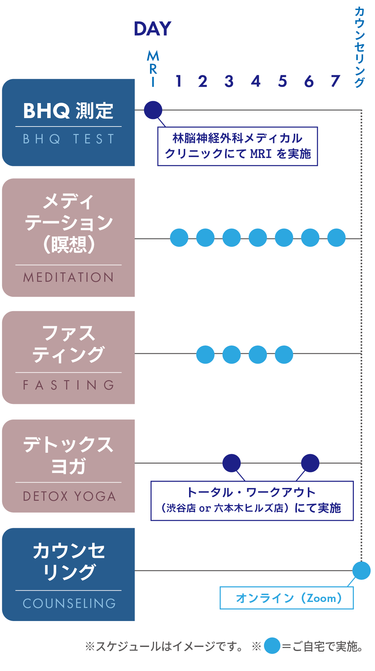 - BRAIN DETOX プログラムでは、連続した4日間のファスティングが予定されています。ご希望の実施スケジュールの間に会食など決められた食事のご予定がある場合は、その期間を避けてスケジュールを組むようにしてください。ファスティング期間中のカフェイン・アルコールの摂取はできません。また、ご自身で食事をご用意いただいたり、炊飯をしていただくメニューもございます。毎日のお風呂に使用していただくホットタブもキットに入っています。