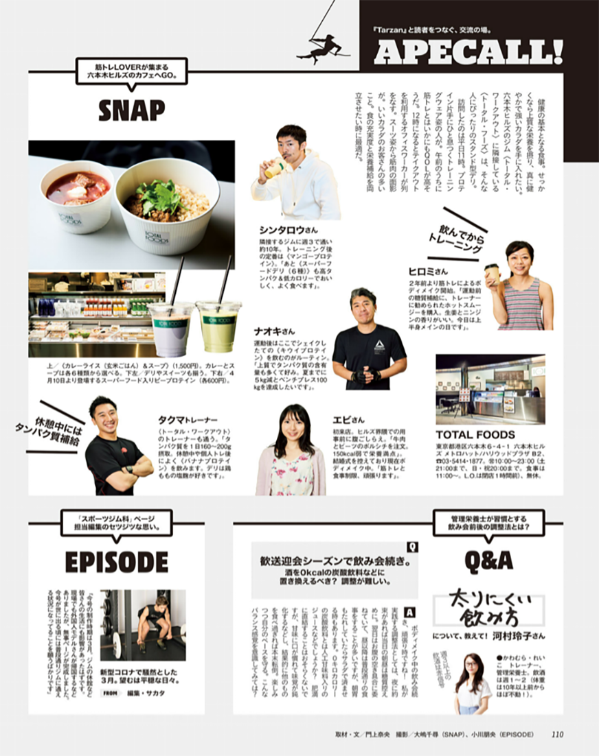 『「あのジム・スポーツ施設のお客さんSNAP!」筋トレLOVERが集まる六本木ヒルズのカフェへGO』と題して、トータル・フーズおよび人気メニューである、「カレーライス(玄米ごはん)&スープ」や新商品である「スーパーフード入りピープロテイン」などをご紹介いただきました。