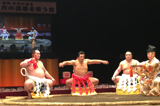 5月31日両国国技館にて、九重親方(元横綱 千代の富士)の還暦を祝う会が行われ、1300名が駆けつけました。昭和最後の大横綱 千代の富士こと九重親方は現役横綱 白鵬、同じく横綱 日馬富士を両脇に見事な土俵入りを果たされました。アリーナでは、この日のために取り組んできたトレーニングシーンも上映され、その姿は還暦とは思えないほどのみなぎったパワーを持ち、その場にいた全ての人が魅了されておりました。