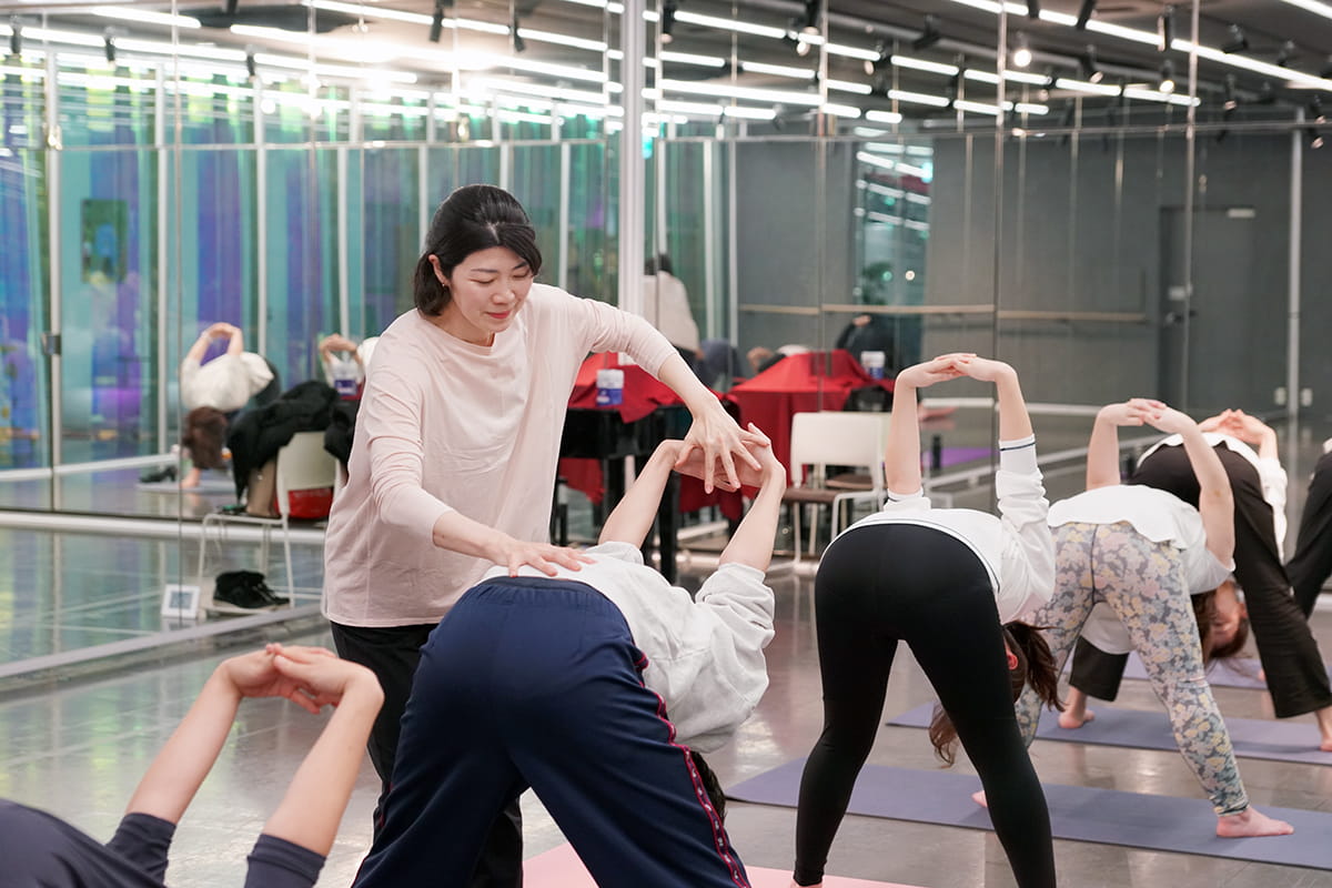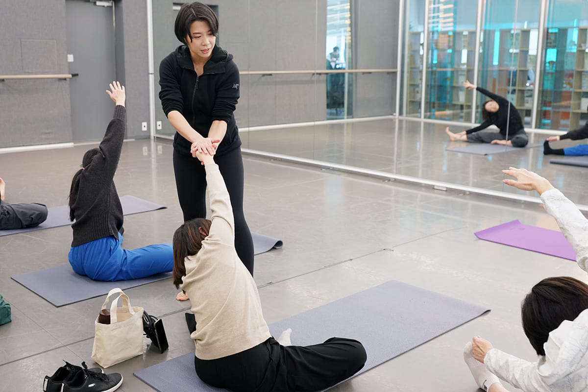 健康サポートプロジェクトの中でもリピーターが多い、前川洋子トレーナーによるピラティスは、あえてどんどんカラダを動かし、動きの中で意識しづらい体幹を目覚めさせ、日常の動作がぐっと軽くなる感覚を体感するアプローチ。