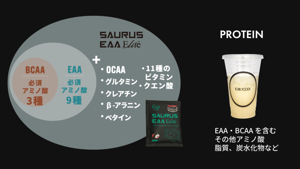 EAAは9種類の必須アミノ酸をすべて含み、BCAAは必須アミノ酸のうち運動中のエネルギー源となり筋肉の分解を防ぐ効果の高いバリン・ロイシン・イソロイシンの3種類のみ含んでいます。