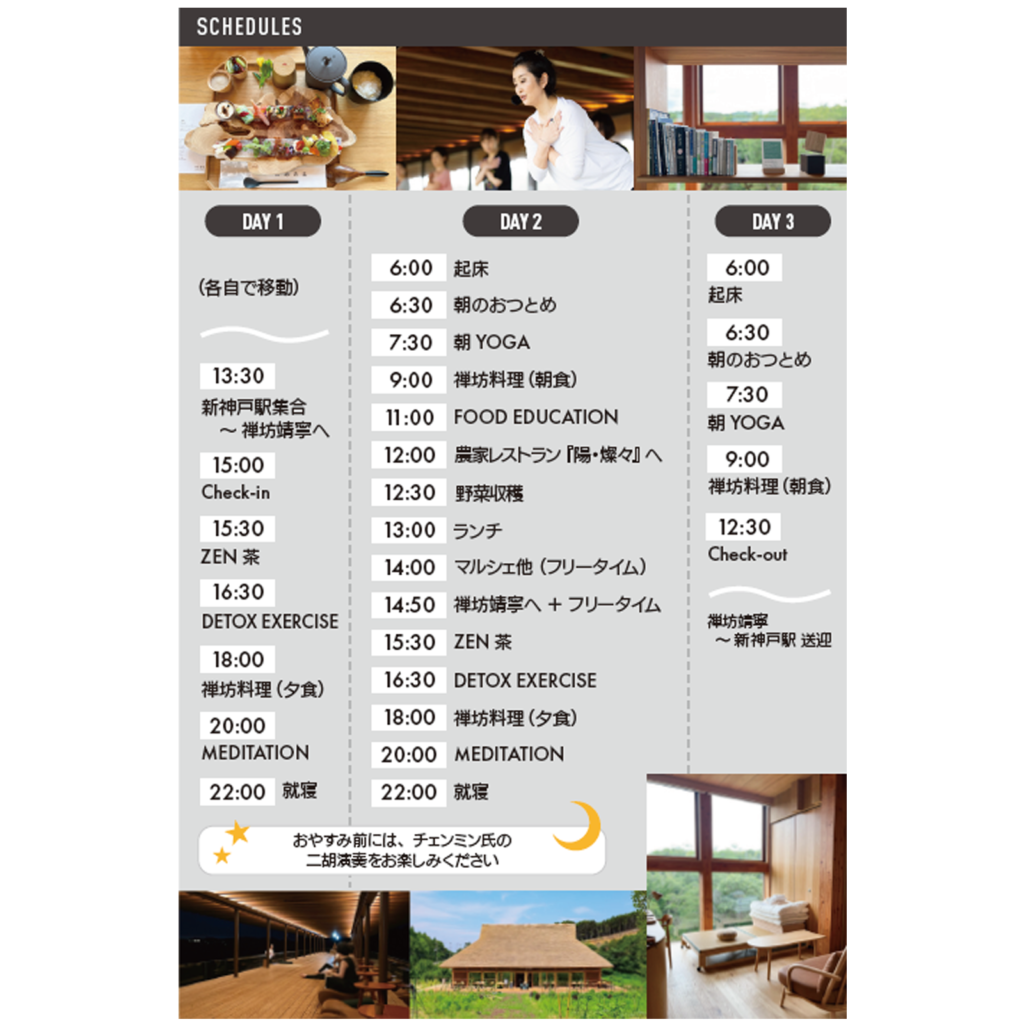 「醸造料理人」伏木暢顕シェフが手掛ける禅坊料理は、腸内環境ケアを徹底的に考慮しています。動物性食品を一切使わず、天然醸造の調味料と旬の食材をふんだんに使用することで、なんと1食に約30億個もの微生物が含まれる滋味あふれる料理を提供します。昨年、新たに導入された「循環型農業」体験では、参加者自らが畑で野菜を収穫し、自然のエネルギーと微生物を直接感じながら、食の成り立ちと「ココロを整える食」について深く学ぶことができます。