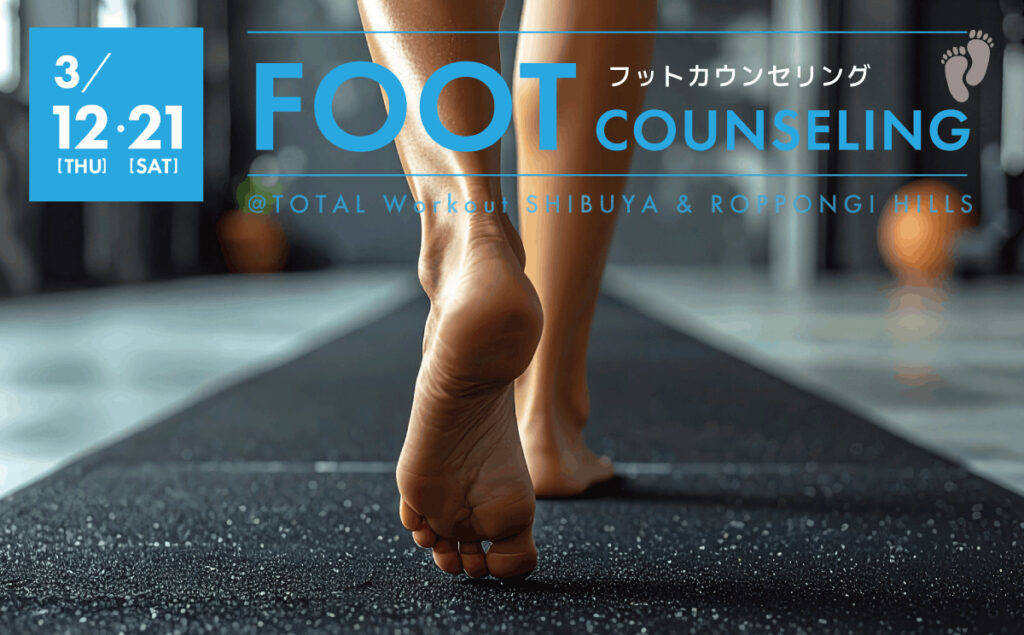 フィートインデザインの協力のもと、トータル・ワークアウト渋谷店、六本木ヒルズ店にて、会員様限定のフットカウンセリングを実施します。