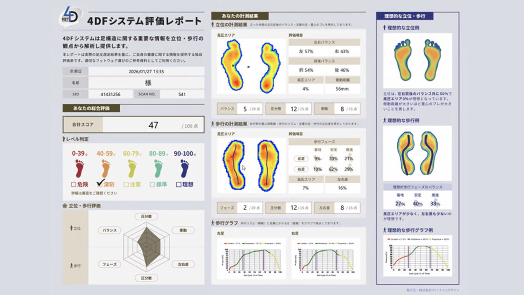 足圧四次元計測機器「4DFシステム」を使用し、立っている時だけでなく、歩行時の重心の動きまで可視化し、足の崩れ方を数値と点数で明確に評価。感覚に頼らない、根拠に基づいたフットカウンセリングを体験していただけます。