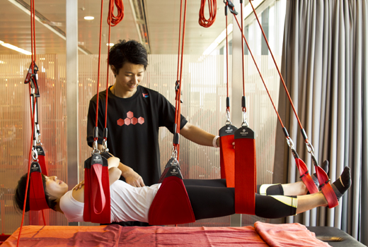パーソナル・トレーナーとマンツーマンのトレーニングでは、従来のウエイト・トレーニングを中心としたトレーニング内容を進化させ、Redcordを用いたトレーニングでカラダを内側から変化させられる内容をプラスしました。
