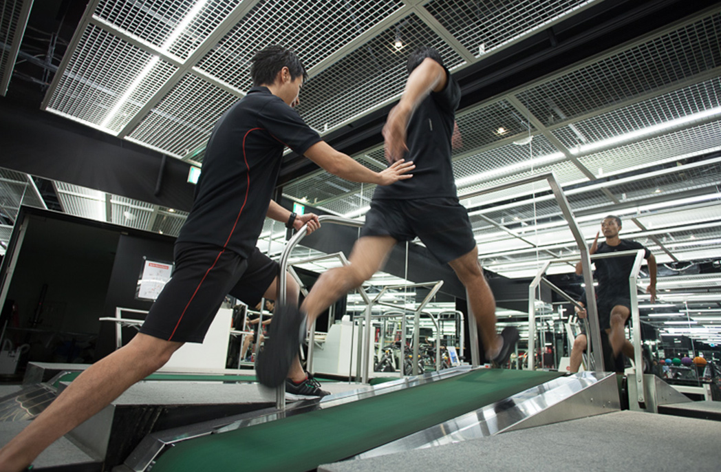 使う筋肉への意識を高めながら、競技性を重視する持久力トレーニングです。母指球のプッシュ意識を強化できます。カーブ・トレッドミルを走るとつま先からの接地ができます。腱を伸ばしてパワーを溜め込み、蹴る瞬間に腱が縮む勢いで加速する、というバネの特性を活かした走り方ができるので、筋肉の意識向上や心肺機能の最大化に繋がります。