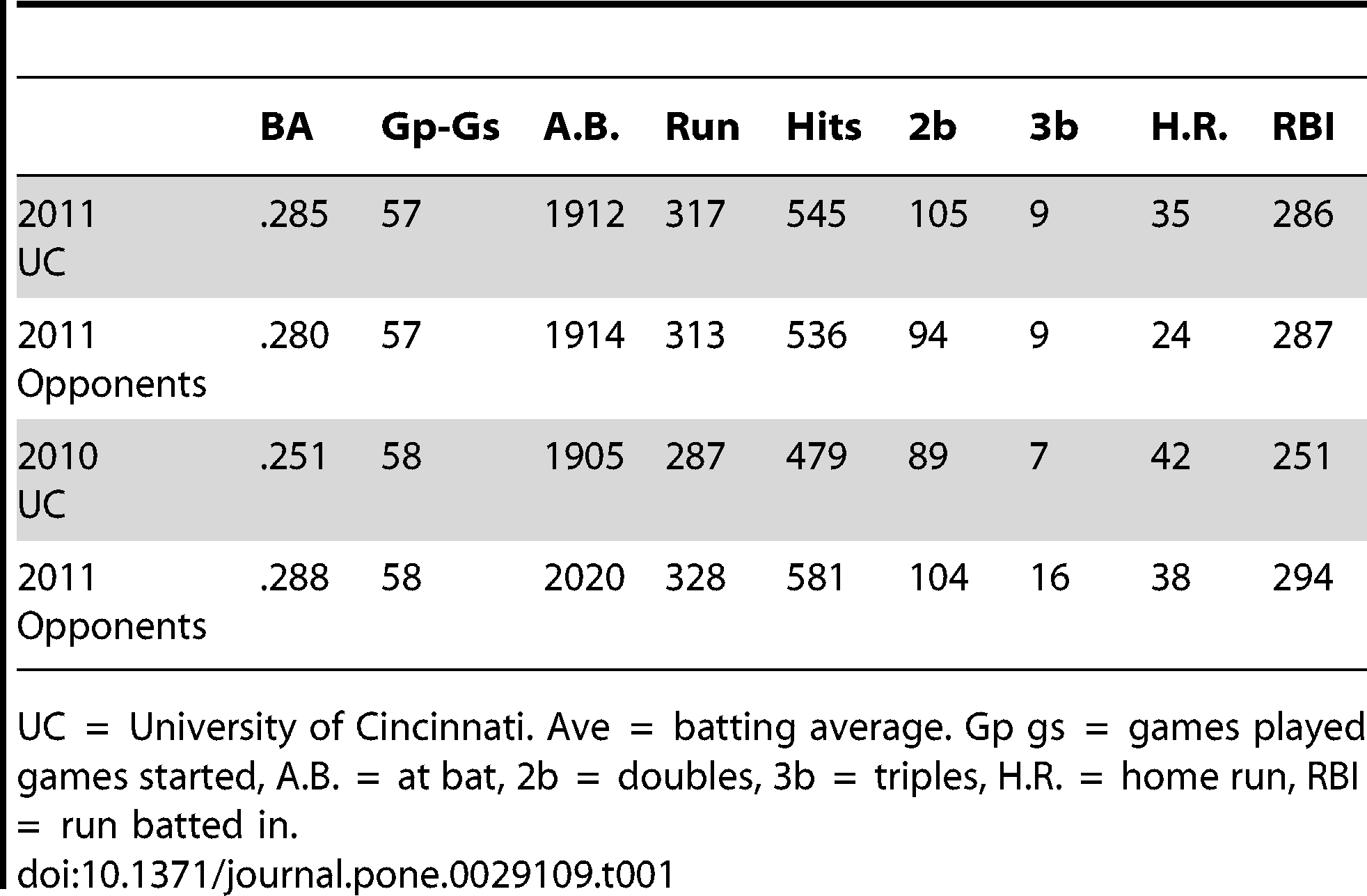 シンシナティ大学野球選手を対象に2010年シーズンと2011年シーズンを2年連続で分析を実施しました。その結果、ストロボ視力トレーニングの前後でチーム打率は.251から.285に上昇。.034向上したことが確認できました。